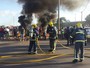 Eles usaram pneus queimados na entrada da Cidade do Automóvel.Corpo de Bombeiros e Polícia Militar foram acionados.