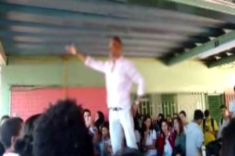 No vídeo registrado durante a confusão, ele critica os professores. “Eu sou contra esses sindicalistas de carreira que mamam [sic] nas tetas do governo”, disse.