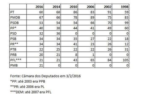 Ao longo dos quase vinte anos que separam 1998 a 2016, outros partidos também tiveram quedas importantes nas suas bancadas. No segundo mandato do tucano FHC era natural que o seu partido fosse uma das maiores bancadas, em 1998, com 99 deputados. Hoje o PSDB conta com 53 deputados no exercício do mandato. O partido só era superado em 1998 pelo aliado PFL (hoje DEM), que tinha 105 cadeiras em 1998 e hoje é a nona maior bancada, empatada com o PMB.
