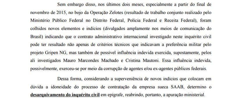 De acordo com o procurador, os novos elementos e indícios indicam que : “o contrato administrativo internacional investigado neste inquérito civil pode ter resultado não apenas de critérios técnicos que indicavam a preferência militar pelo projeto Gripen NG, mas também de possível influência indevida exercida, supostamente, pelos ali investigados Mauro Marcondes Machado e Cristina Mautoni. Essa influência indevida, possivelmente, exerceu-se por meio da corrupção de agentes e/ou ex-agentes públicos federais”.